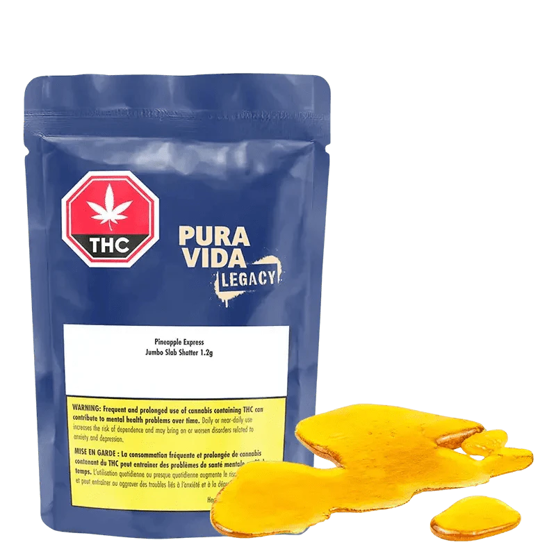Introducing the Pura Vida Legacy Pineapple Express Jumbo Slab Shatter (1.2g) produced via hydrocarbon extraction to produce a radically golden and brittle concentrate. We're slinging Pineapple Express, a cross of the Trainwreck & Hawaiian strains, for when you want to board a train ride of action-packed enlightenment. This hybrid strain is not messing around, with notes of bright citrus, tangy pineapple, and crisp pine for a taste combination that'll shake things up in the best way.